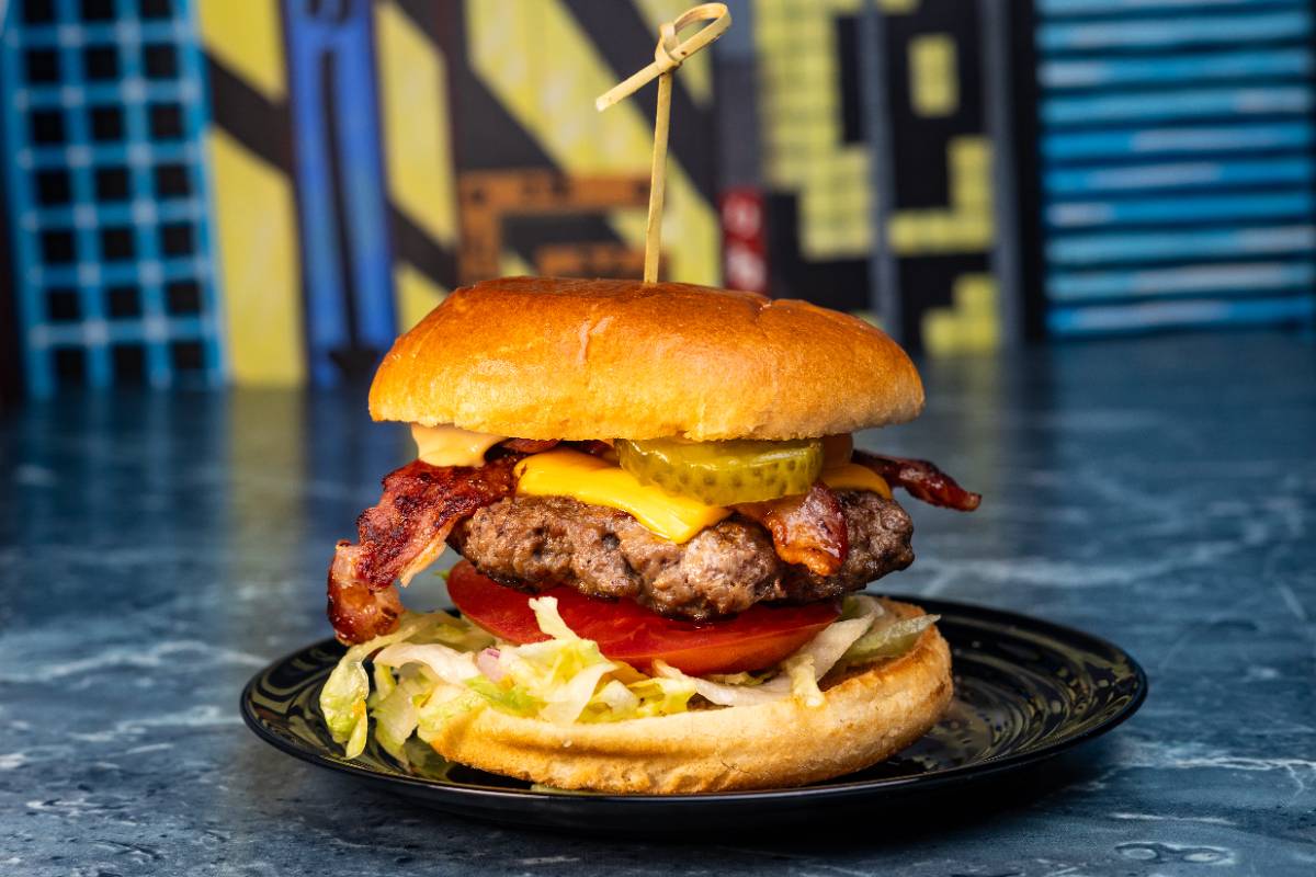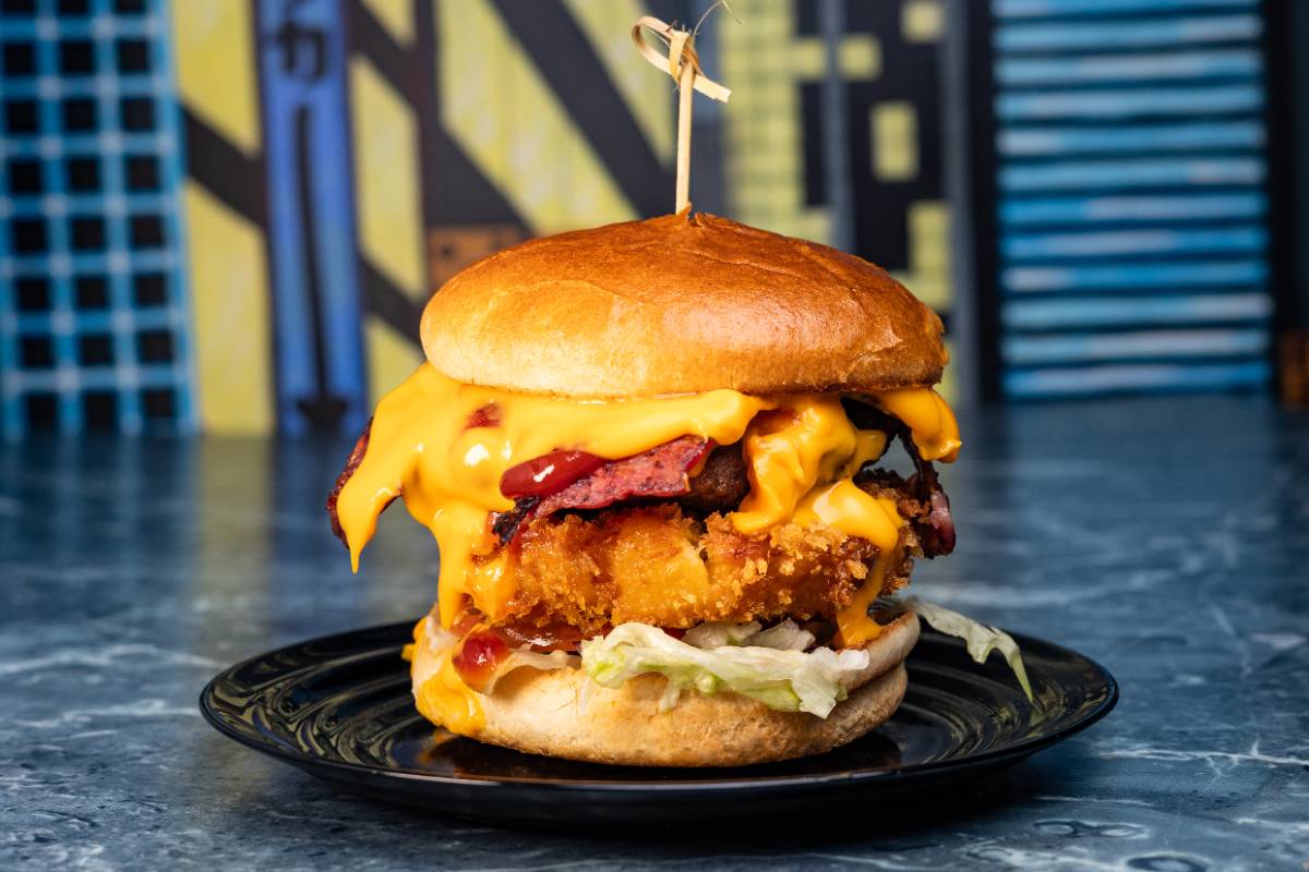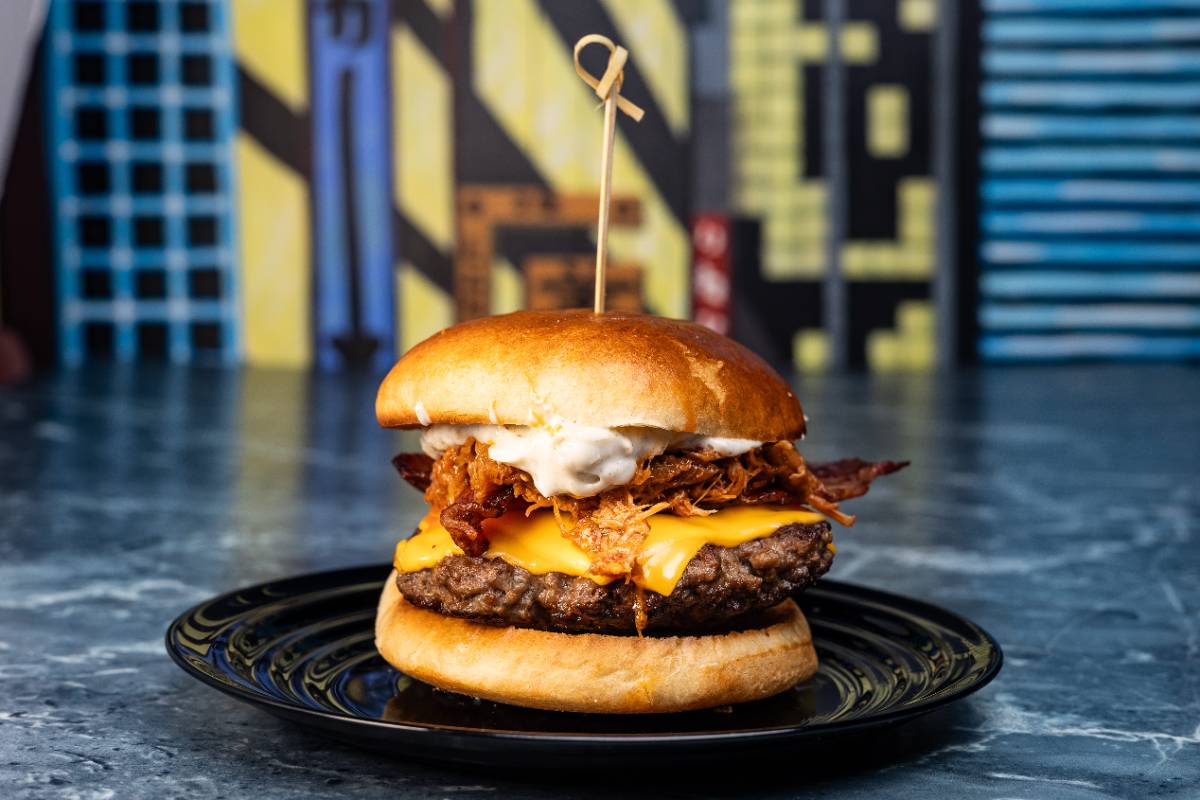 Beef patty with BBQ pulled pork, streaky bacon, sliced cheese, crispy onions and a dollop of our baconnaise.