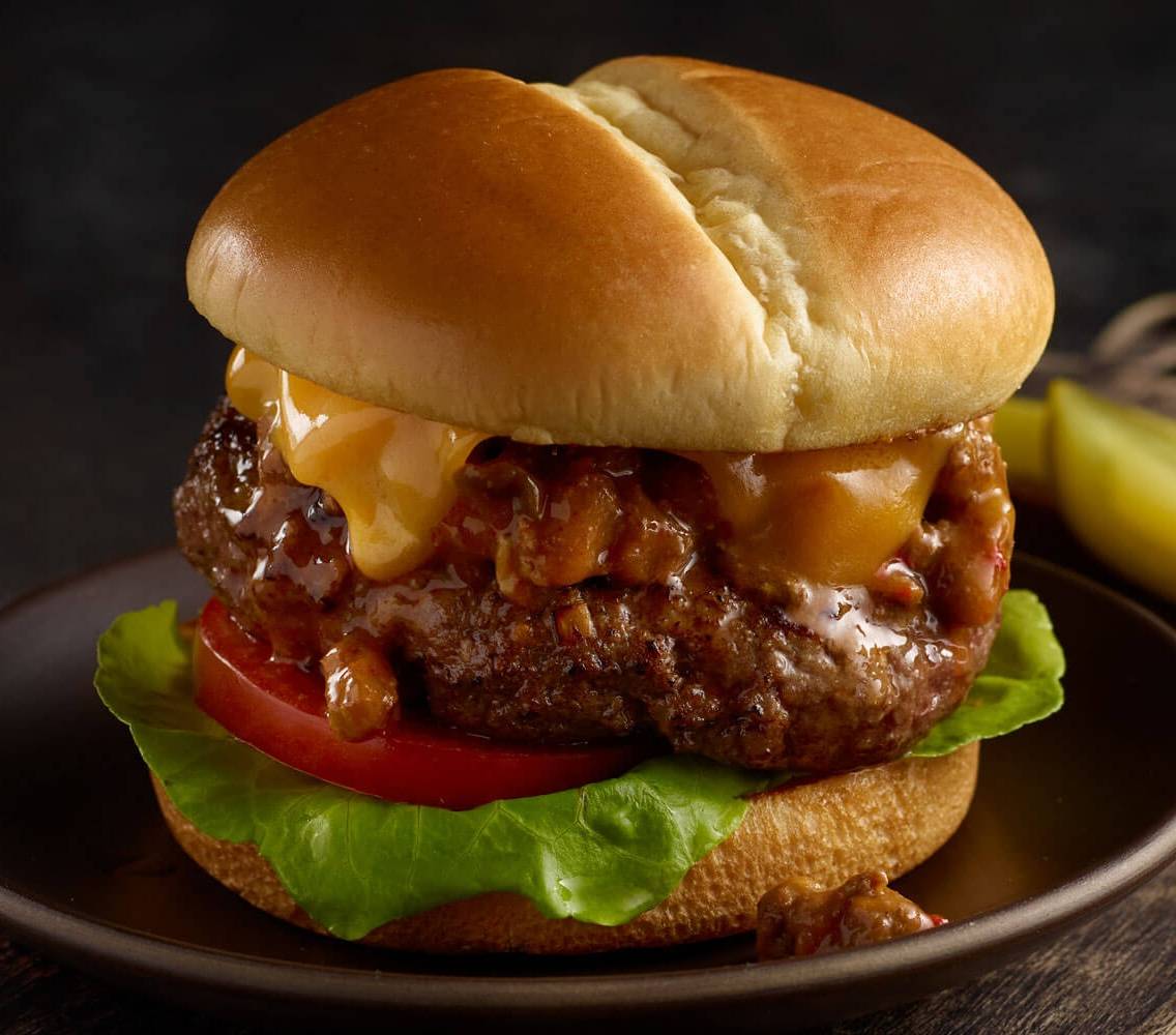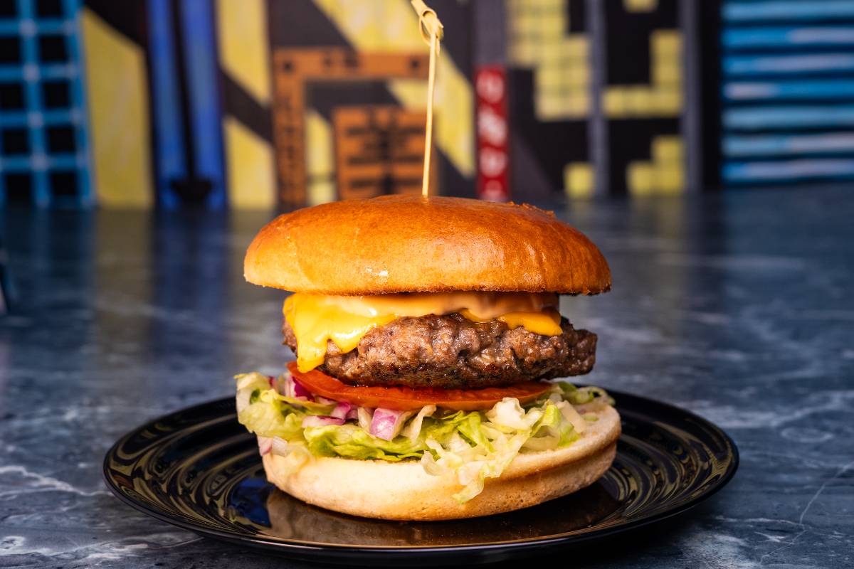 Beef patty, Burger and Mexican Now chilli con carne, sliced cheese, cheese sauce, lettuce, red onion, tomato and jalapeno peppers. Be warned this one is hot!