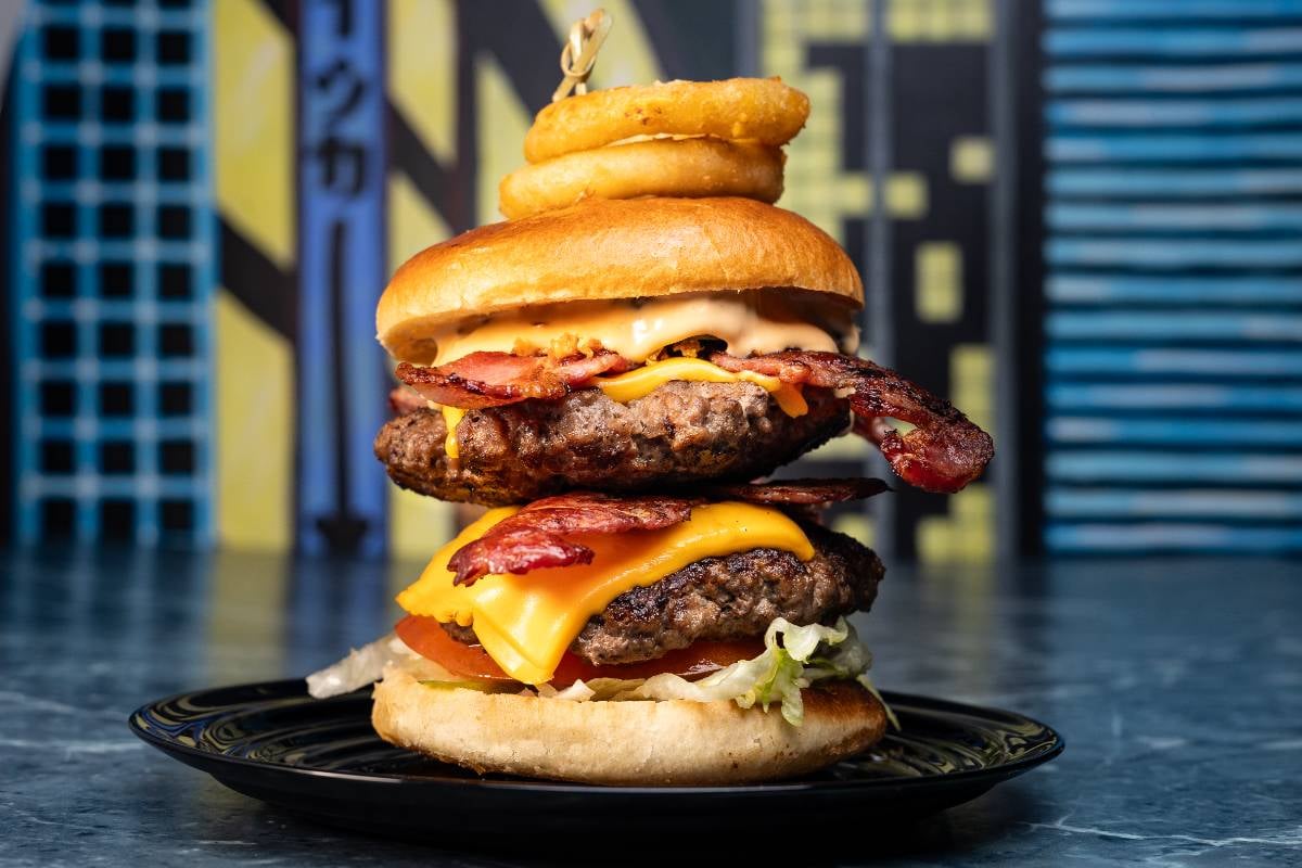 Double beef patty, sliced cheese, streaky bacon, onion rings, sweet bacon jam, crispy fried onion, lettuce, tomato, red onion, Burger and Mexican Now sauce and topped with gherkins. This one is not for the faint hearted.