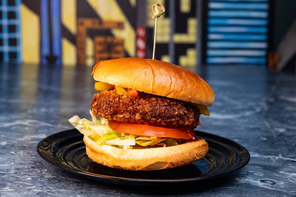 Lemongrass and pepper patty, roasted peppers, lettuce, tomato and red onion topped with chilli jam.